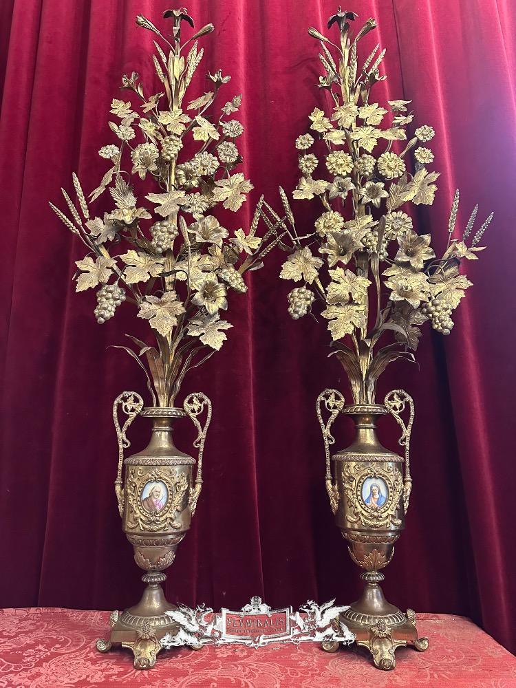 Pair Classicistic Exceptional Floral Altar Pieces 140 Cm High ! Very High Quality Enamel Representations Of St. Mary & St. Joseph
