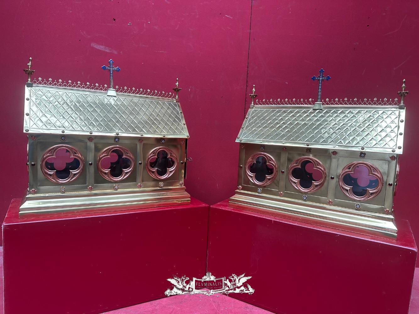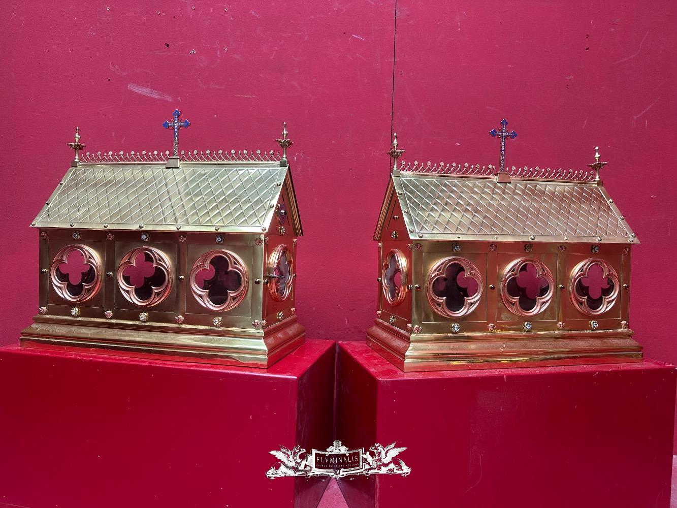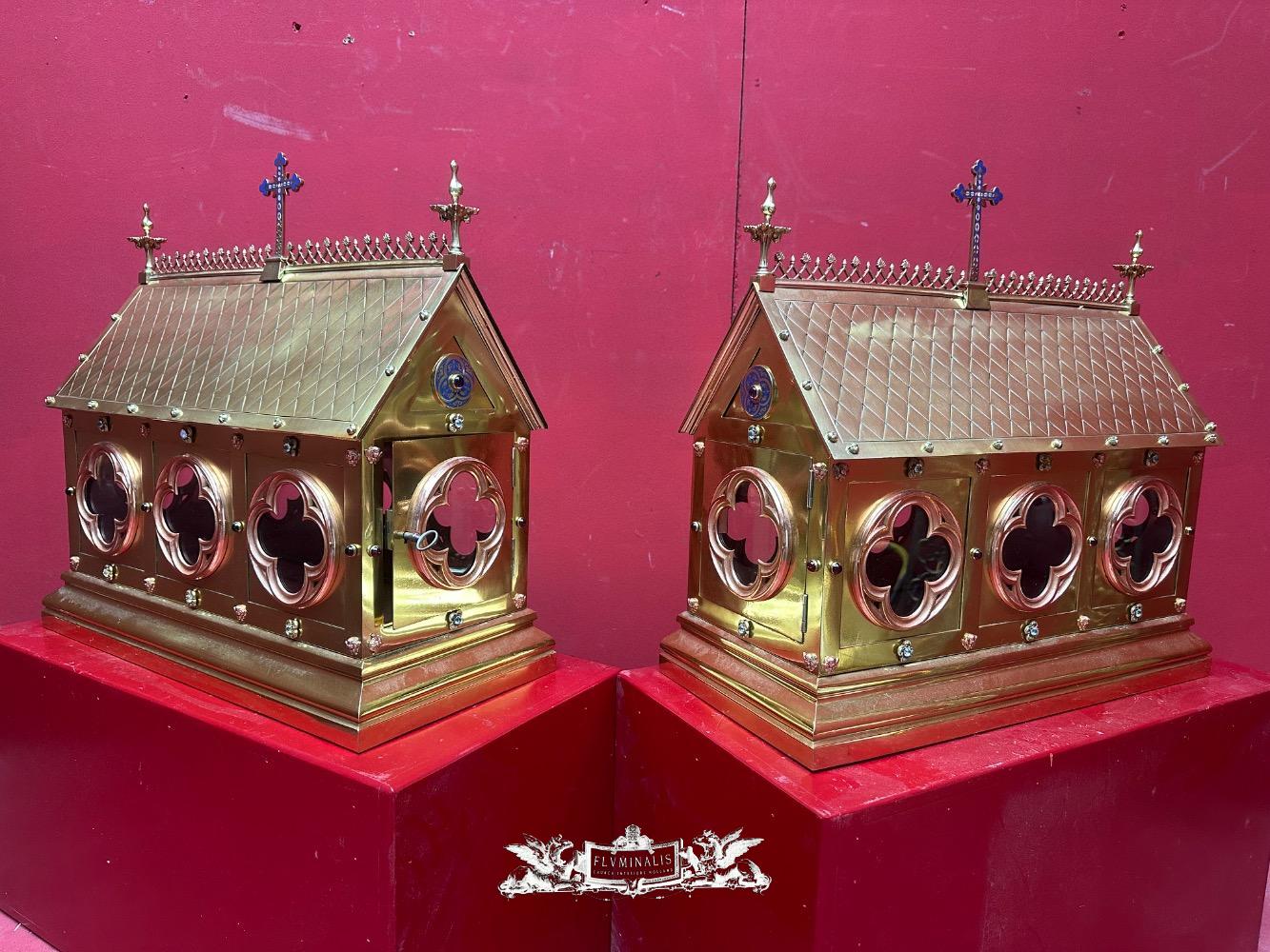 Exceptional Large Reliquaries style Gothic - Style en Brass / Bronze / Polished and Varnished / Enamel / Stones / Glass, France 19 th century ( Anno 1865 )