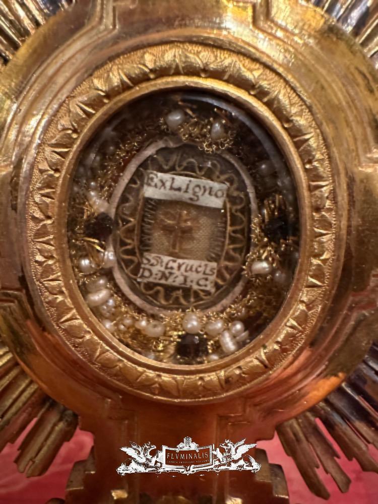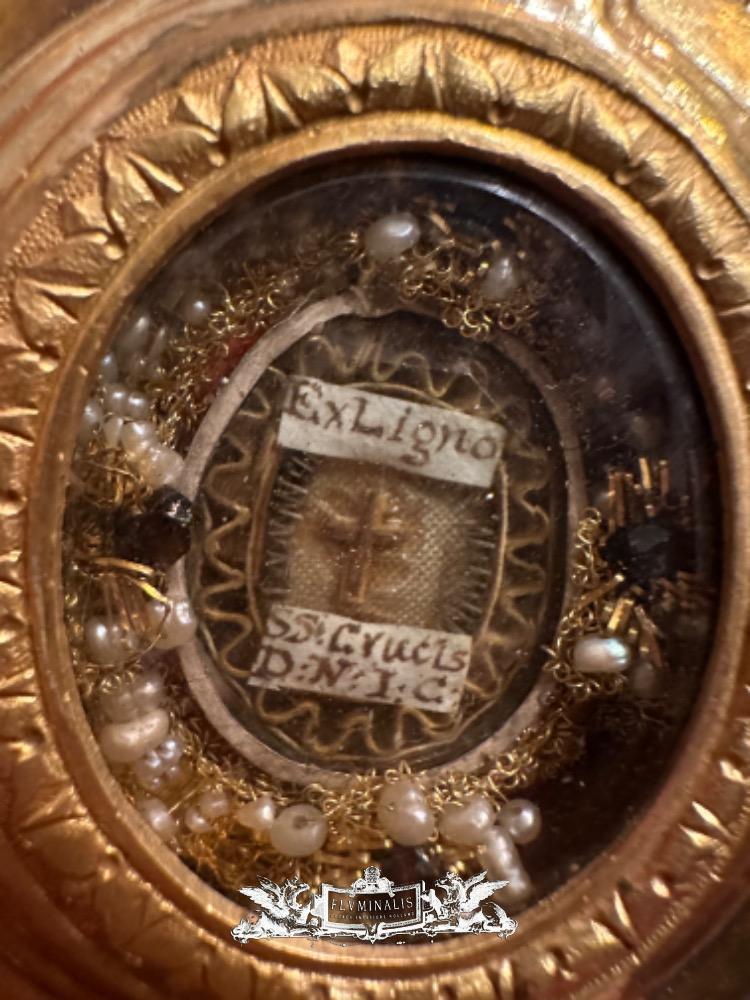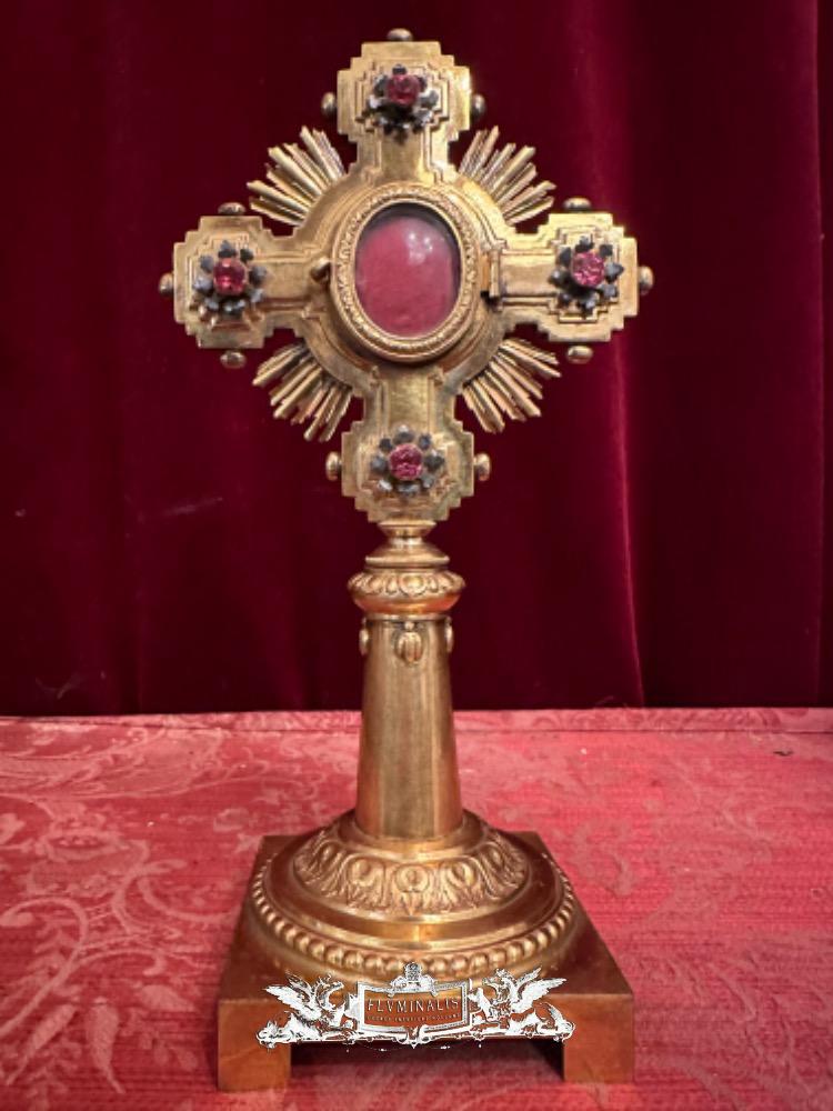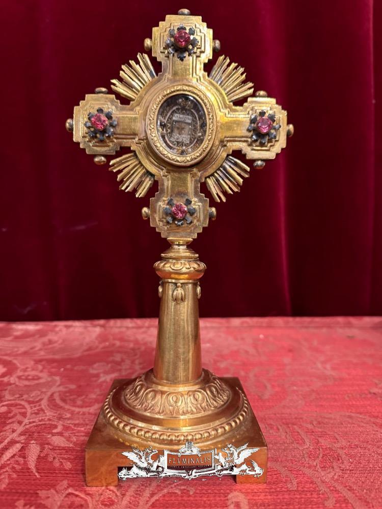 Reliquary - Relic Ex Ligno S. Crucis D.N.J.C. With Original Case en Bronze / Gilt / Stones / Glass, Italy 19 th century ( Anno 1875 )