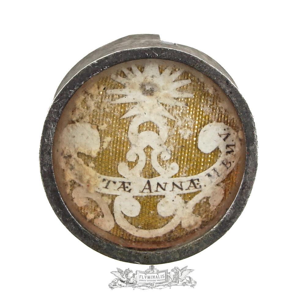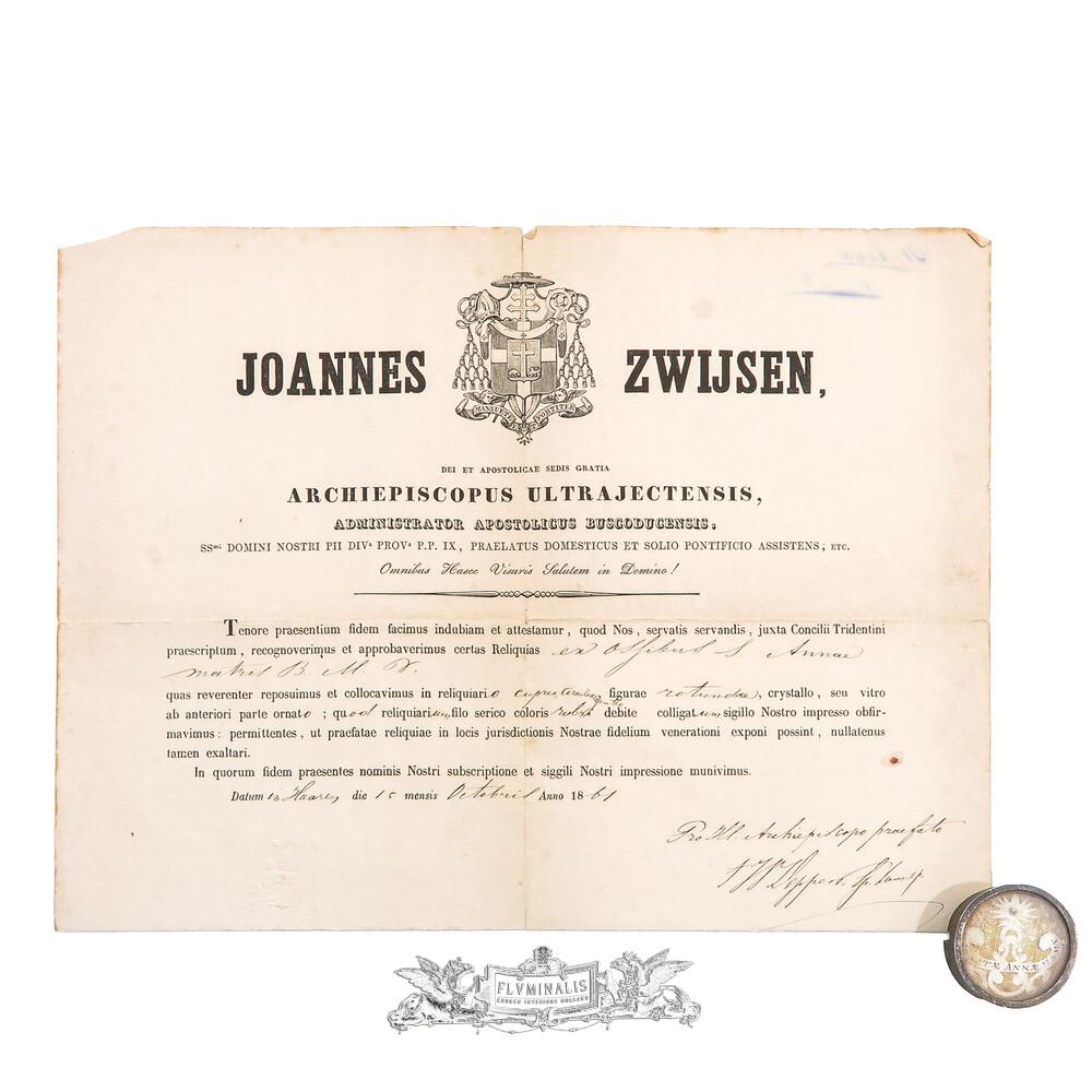 Reliquary - Relic Saint Anne, Mother Of Mary And Grandmother Of Christ (Patron Saint Of Mothers And Families) With Original Document en Brass / Glass / Wax Seal, 19 th century