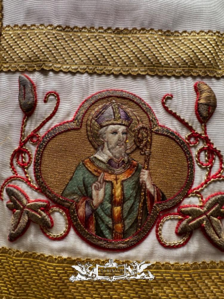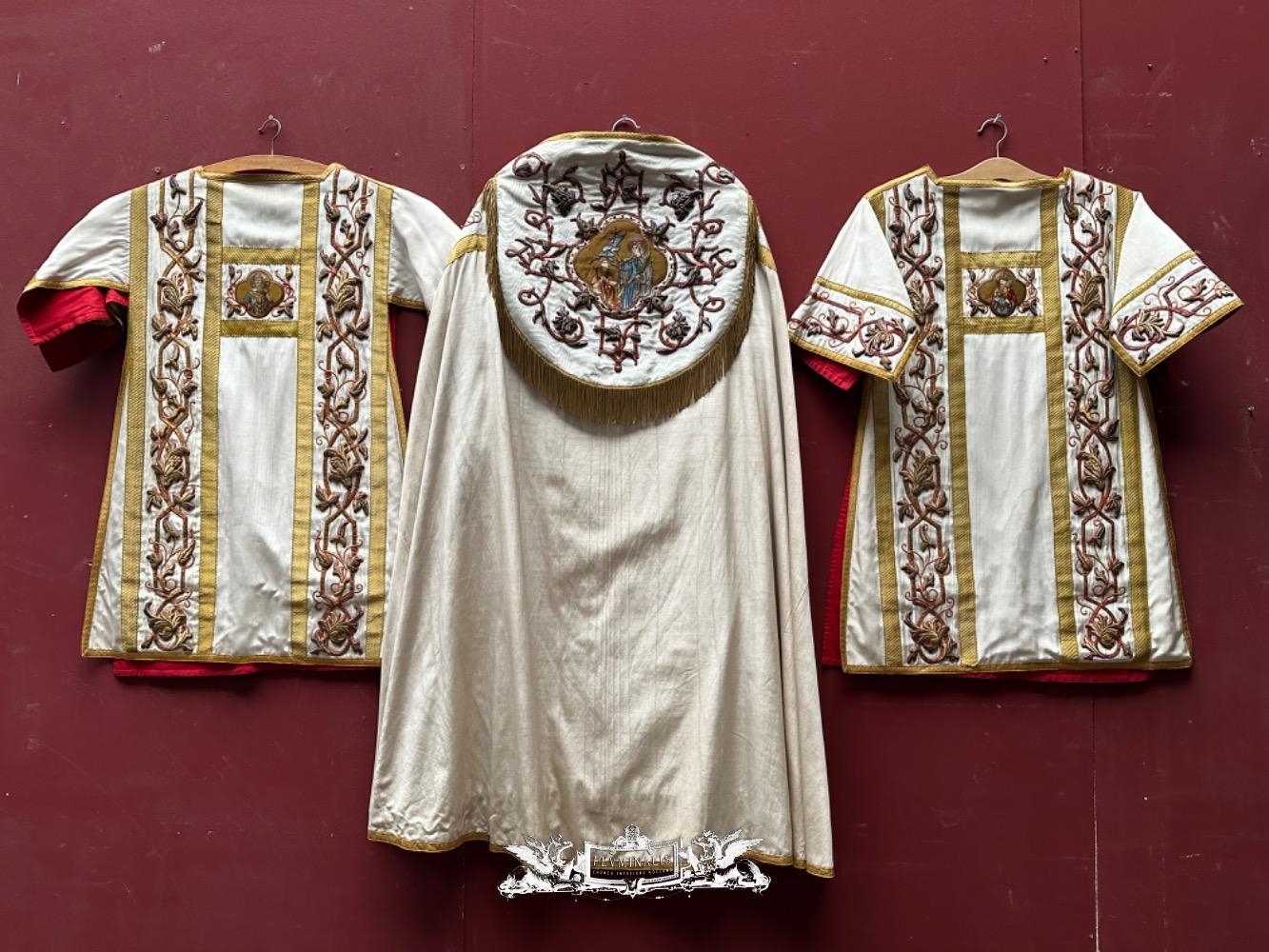 Gothic - Style Complete High - Mass Set, With Chasuble , 2 Dalmatics, Cope, 3 Maniples, 2 Stoles, Burse & Chalice - Veil. en White Velvet / Brocade Stickery, Southern Netherlands 19 th century