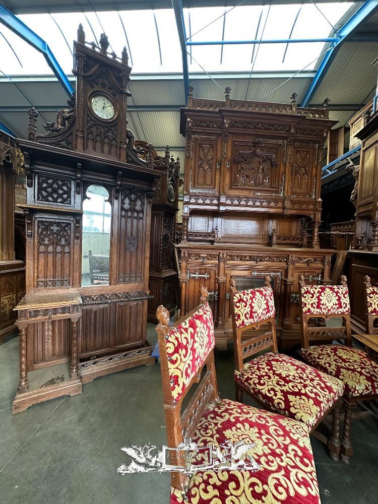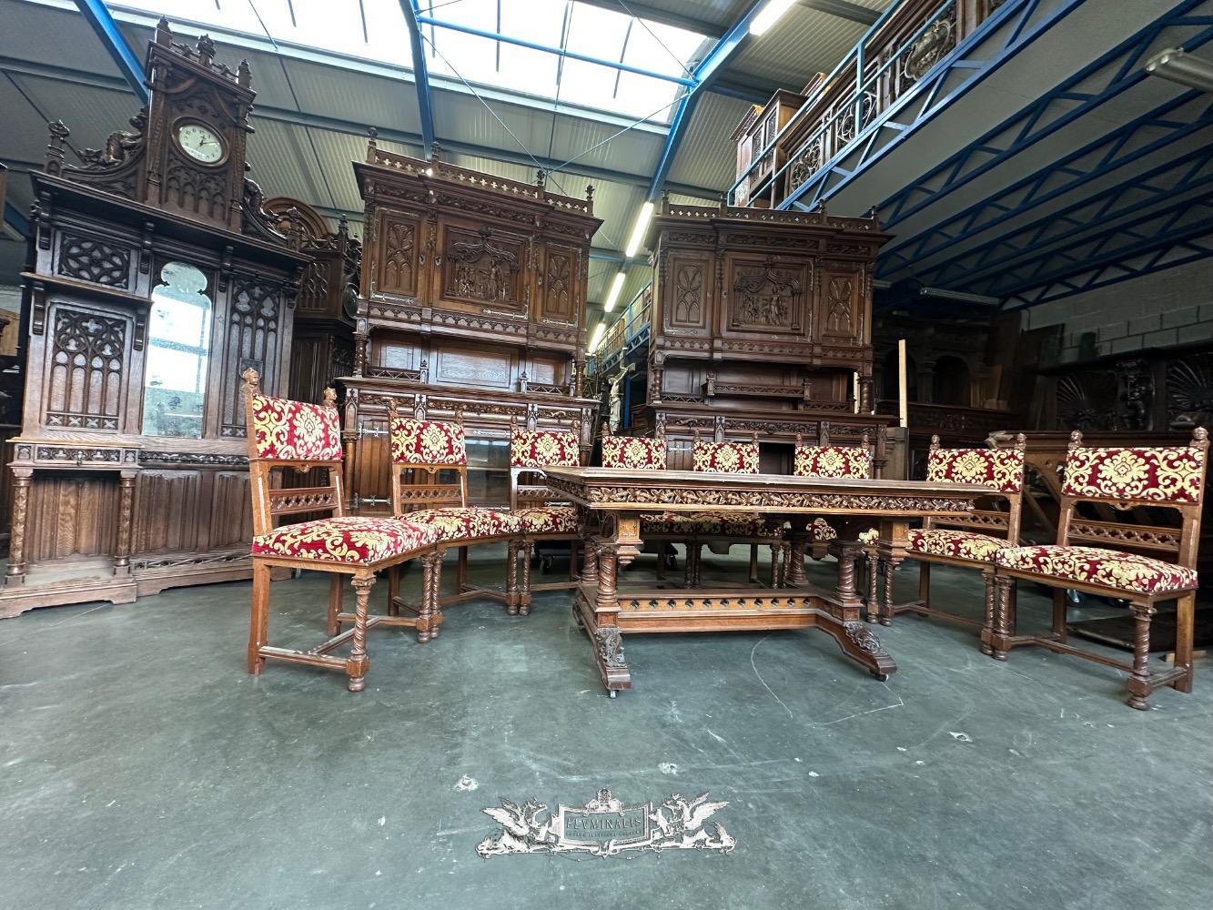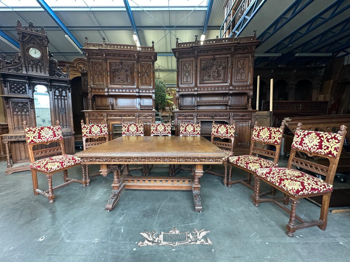 Table Adjustable With Chairs style Gothic - Style en Oak wood / Fabrics, France 19 th century