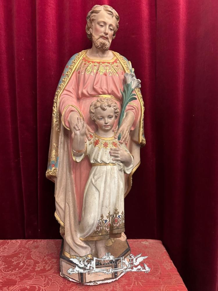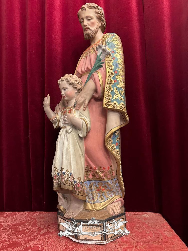 St. Joseph With Child Statue style Gothic - Style en Terra - Cotta Polychrome, France / Sainterie van Vendeuvre-sur-Barse 19 th century ( Anno 1865 )