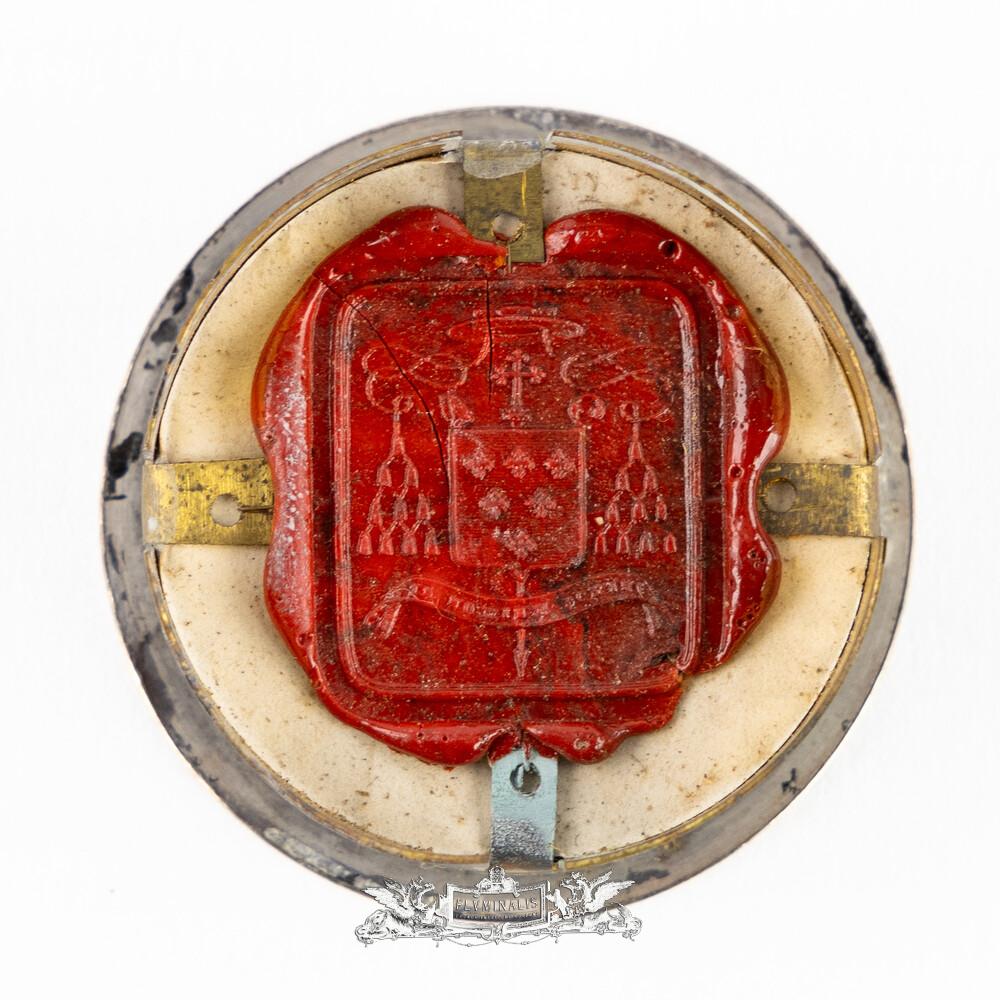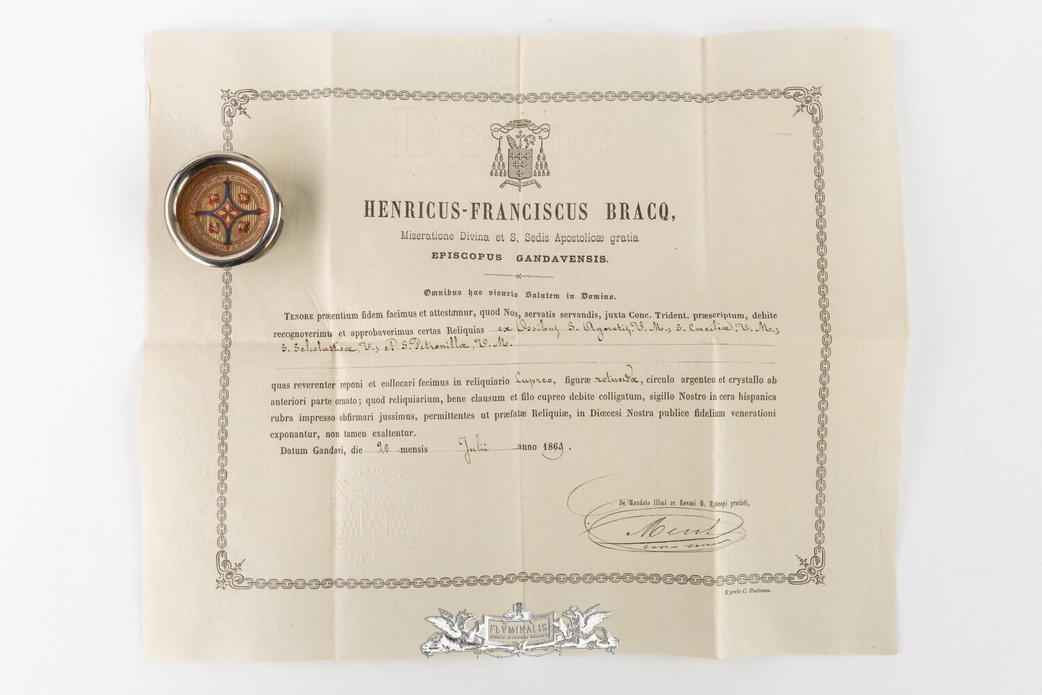 Multi Reliquary Ex Ossibus Relics : S. Agnes, S. Cecilia, S. Scholastica,S. Petronilla. With Original Document en Brass / Glass / Wax Seal, Gent - Belgium 19 th century ( Anno 1869 )